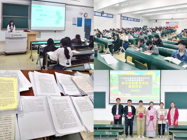 活动开展以来,所有班级学生积极收集相关学习资料,认真自主学习,高质量地完成了实践教学任务和要求,收到了预期的教学效果。课程授课教师沈庆群经过初次筛选和几轮评选,最终评选出《大道之行,美美与共——观大型政论片〈大国外交〉有感》《〈习近平治国理政方略:中国这五年〉观后感》《探寻红色记忆 踏寻红色履痕——听老红军讲述革命故事》《〈论持久战〉读书笔记》等三十篇高质量优秀论文,并于4月19日下午在授课班级教室组织举行综合实践活动颁奖仪式。