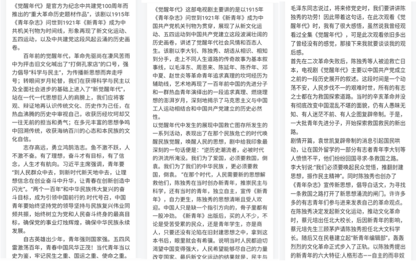 第一阶段,结合“中国近现代史纲要”课程教育教学内容,组织学生观看由中共北京市委宣传部、中共安徽省委宣传部、北京市广播电视局和安徽省广播电视局联合摄制的重大革命历史题材电视剧《觉醒年代》(1-5集)。该剧全面描绘了党成立前后波澜壮阔的革命历史,展现了革命年代热血青年的人生百态。现如今我们正处在建党百年的重要历史节点,通过观看《觉醒年代》带领学生重读党史,感受革命先辈的青春和志气,为青年人指引方向。观看完《觉醒年代》后,同学们写下了观后感。同学们纷纷表示,《觉醒年代》是一面回顾党史的镜子,我们要学好党史,总结经验,在学思践悟中坚定理想信念,在奋发有为中践行初心使命。