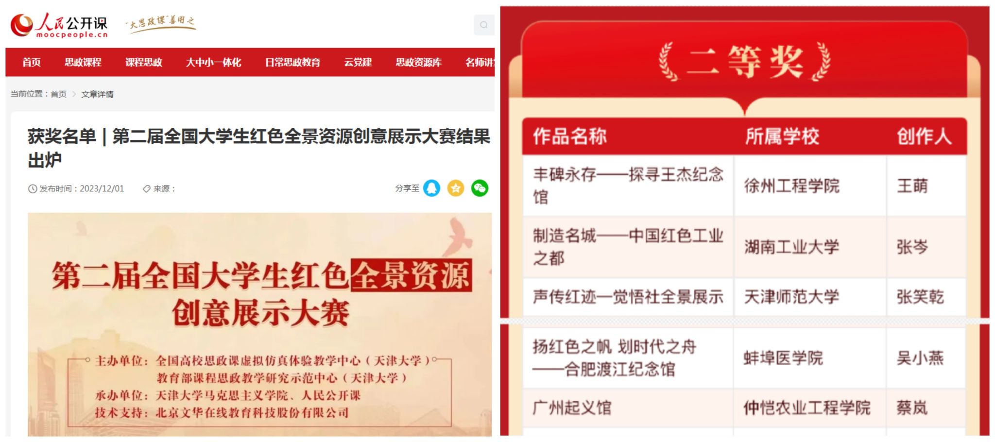 近日,由全国高校思政课虚拟仿真体验教学中心(天津大学)、教育部课程思政教学研究示范中心(天津大学)和人民公开课共同举办的第二届全国大学生红色全景资源创意展示大赛获奖结果公布,成人视频
