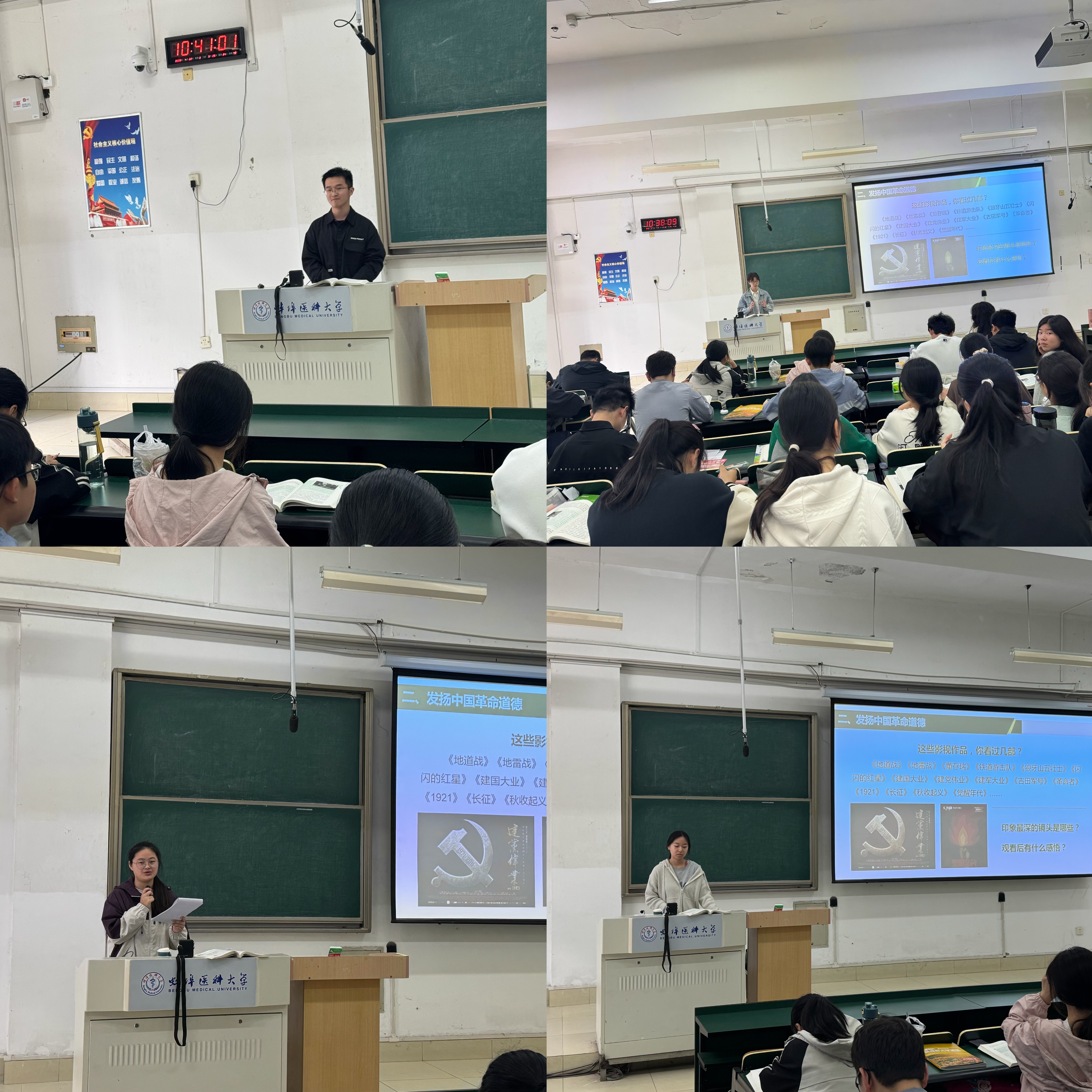 本次活动打破传统讲授模式,由学生主动登台分享自己喜爱的红色影视作品。2024级临床医学专业的唐子慧同学以《觉醒年代》中陈延年、陈乔年英勇就义的片段为切入点,结合剧中“让子孙后代享受前人披荆斩棘的幸福”的经典台词,剖析了早期共产党人对理想信念的坚守;张晓波同学通过《长津湖》《水门桥》的战场场景,还原了抗美援朝战争中志愿军战士“钢少气多”的英雄气概;何晓彤同学选取《古田军号》中确立:“思想建党、政治建军”原则的片段,阐释了党对军队绝对领导的历史必然性。在自由分享环节,同学们还围绕《狼牙山五壮士》等经典影片展开热烈讨论。周如义同学结合《志愿军存亡之战》中松骨峰阻击战的情节,动情说道:“当看到战士们在烧焦的阵地上保持战斗姿势时,我真正读懂了什么是‘最可爱的人’”。分享过程中,既有对电影艺术手法的赏析,更有对历史细节的考证与精神内核的挖掘,现场不时爆发出热烈掌声。
