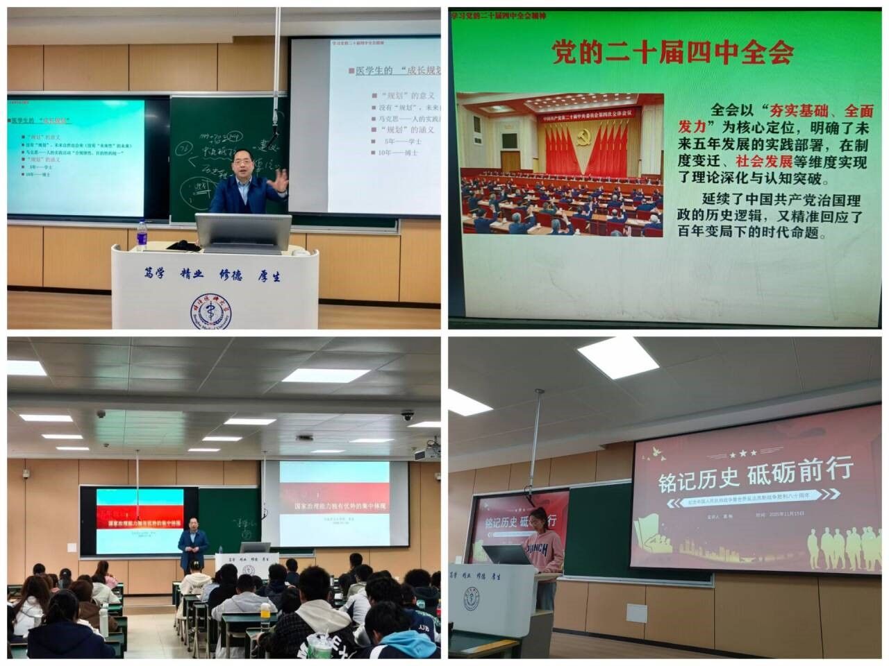 课前,师生团队就如何把理论知识与学生的生活、热点时事以及学生关心的一些重点、难点问题结合起来确定主题开展了多次商讨,确定此次师生同台讲授的主题为“党的二十届四中全会精神的学习”和“纪念中国人民抗日战争胜利80周年”。李乐在课上讲到党的二十届四中全会为国家今后5年指明了前进的方向,医学生5年专业学习成长过程中也应当作出适当的规划。2025级临床医学思政委员葛畅接着老师的话题分享了自己的体会以及对今后5年的总体设想。师生从理论到身边的实例,为同学们带来一堂营养丰富的精神大餐。