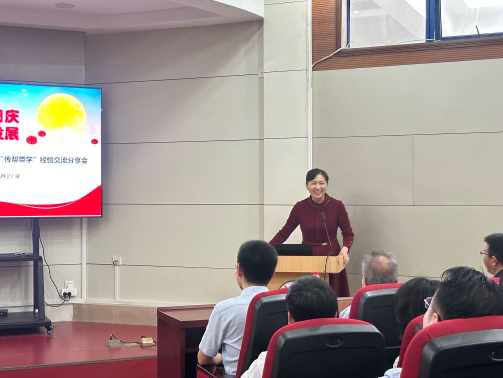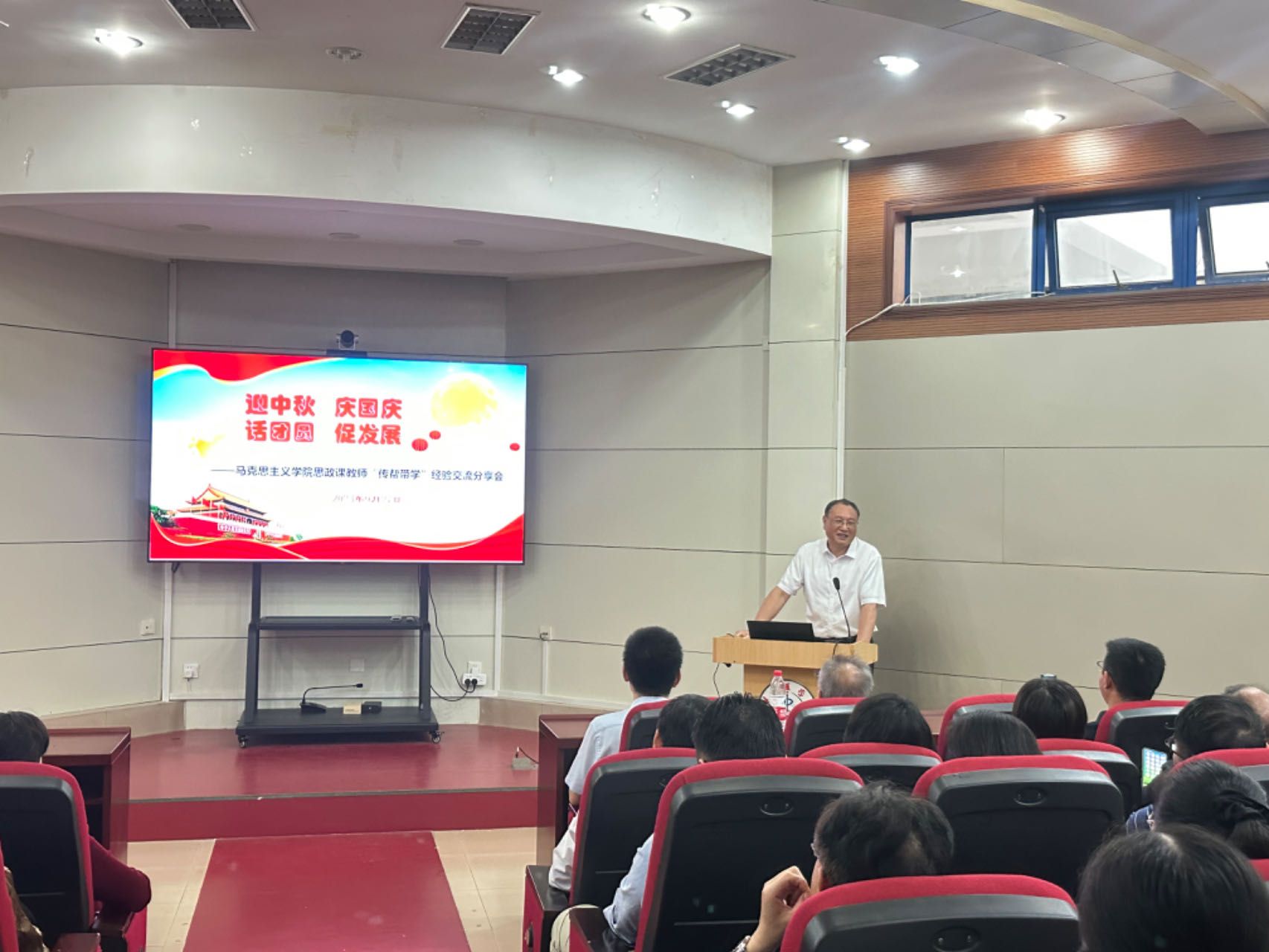 组织开展“迎中秋 庆国庆 话团圆 促发展”主题活动暨思政课教师“传帮带学”经验交流分享会在学校小学术报告厅举行,会议特邀刚退休的齐梅、赵元勤两位教师参加,学院全体思政课教师参加会议,院长熊韵波主持会议。