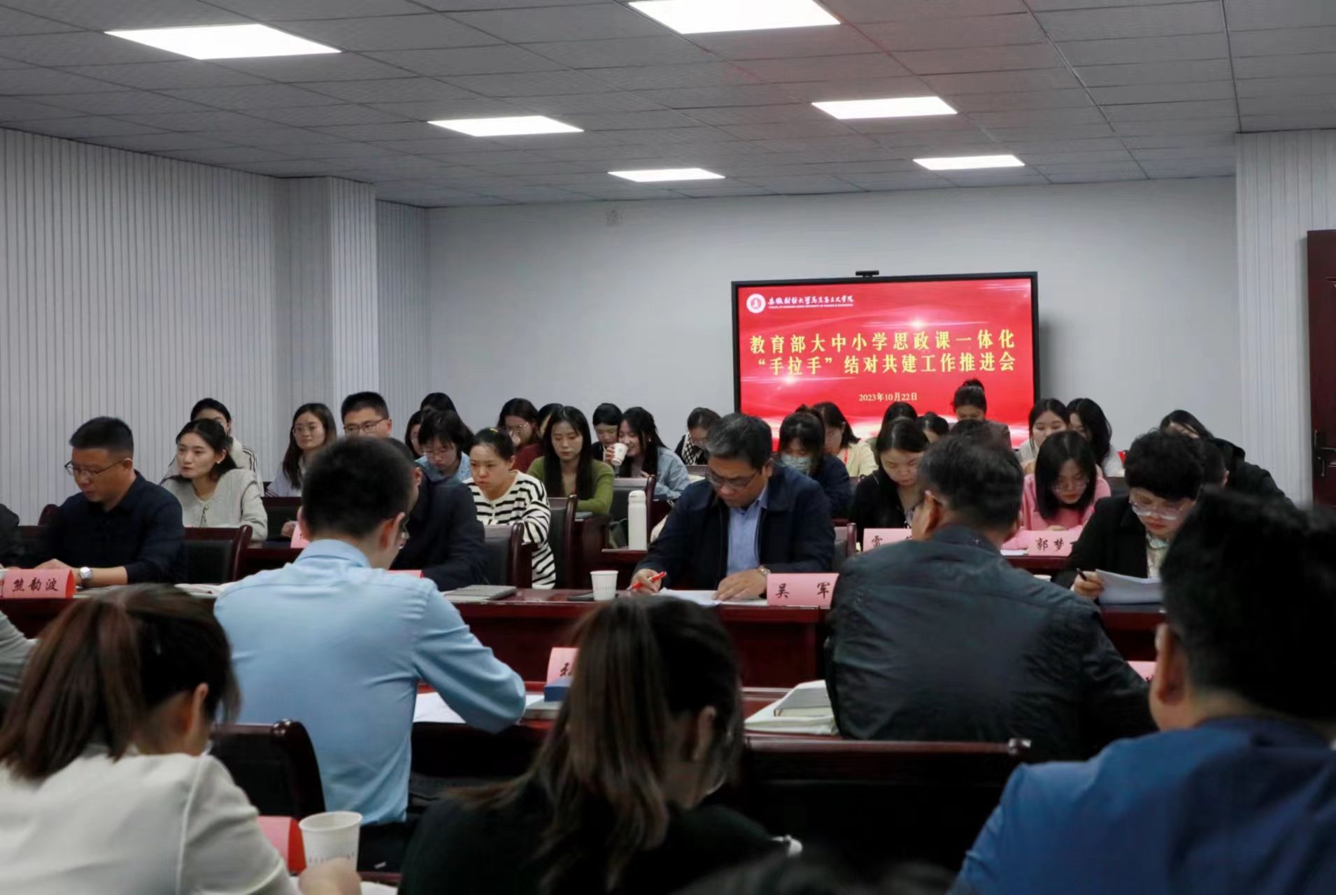 十余名思政课教师和全市大中小学近百名思政课教师一起参加了在安财马院举行的教育部大中小学思政课一体化“手拉手”结对共建工作推进会。会议就蚌埠市大中小学思政课一体化“手拉手”结对共建工作方案(征求意见稿)作了说明,围绕开展教学观摩、集体备课、文化研学、教学研究等活动内容进行了充分讨论,并根据不同结对共建学校进行了分组和做了工作安排。