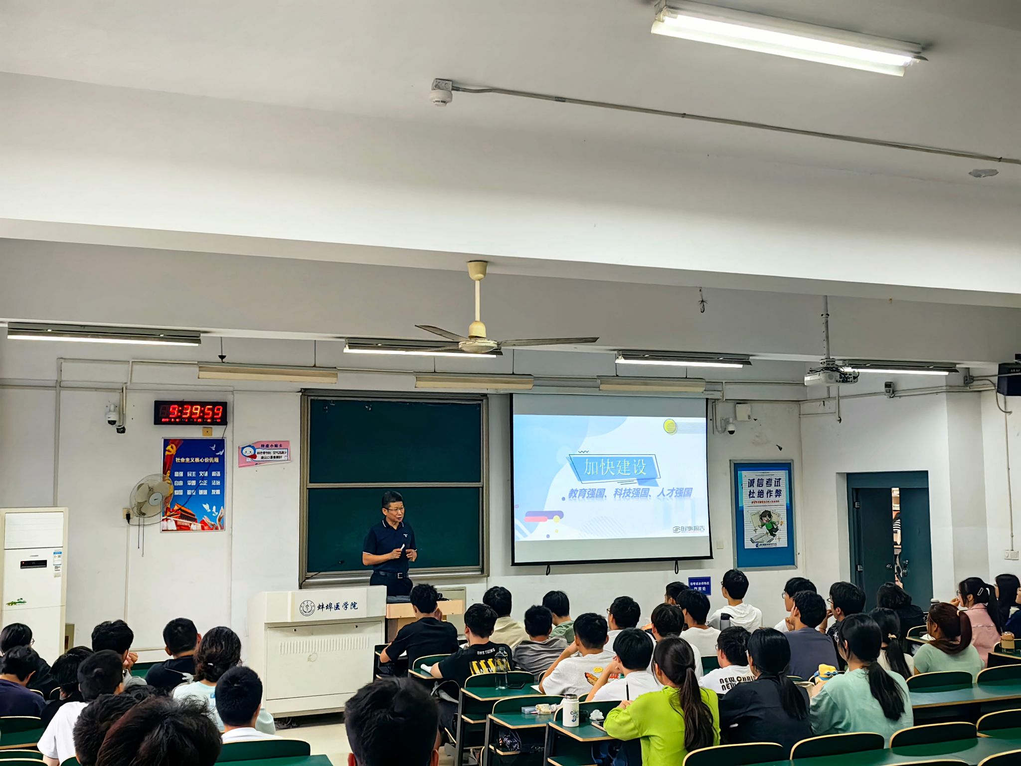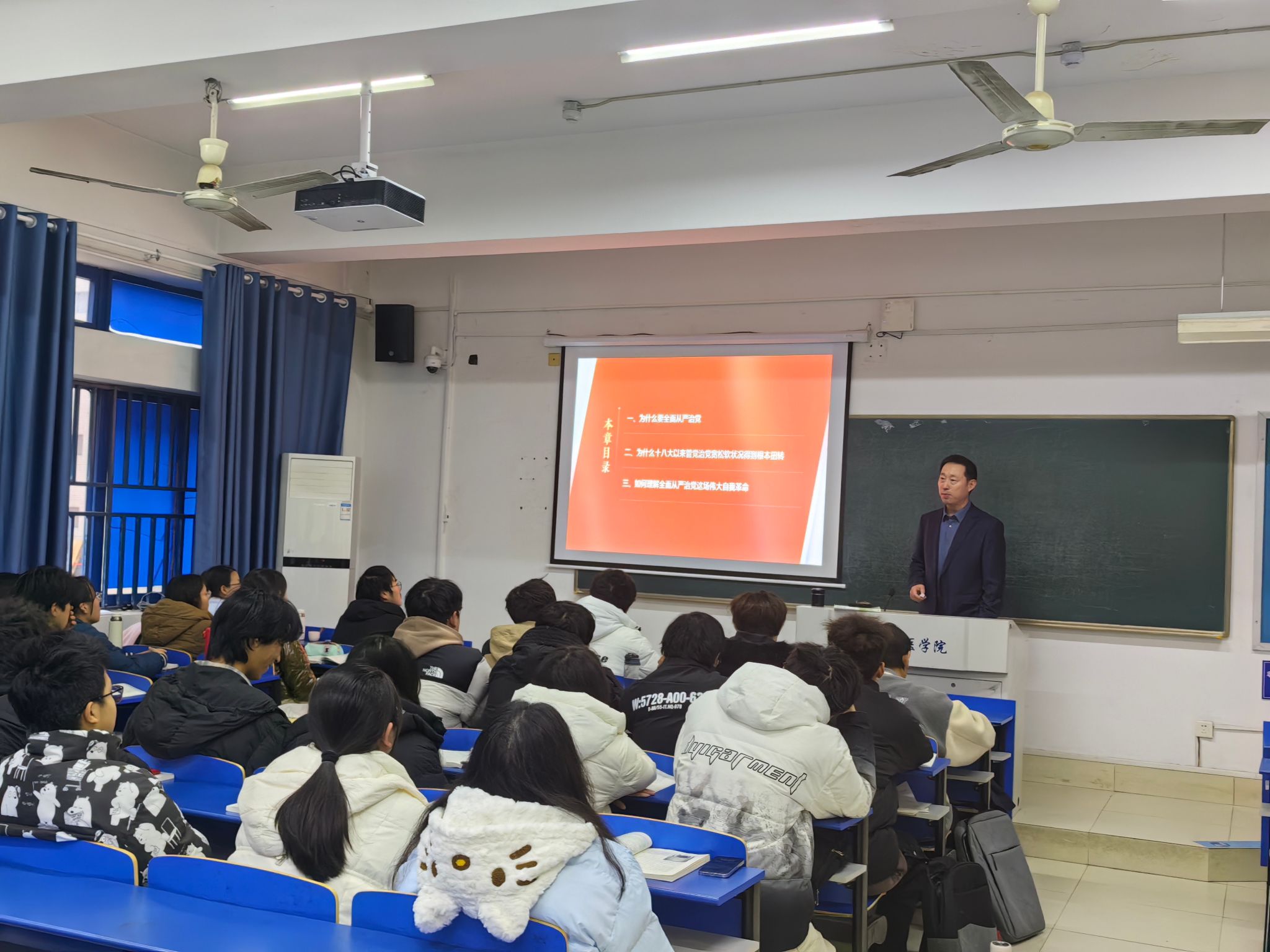 9月13日上午和9月20日下午,校党委副书记姚文兵和副校长陈昌杰,分别在理论教学楼208、108教室,给2022级物联网工程和2023级口腔医学专业班级学生,围绕在强国建设过程中教育、科技、人才三者相辅相成的关系和党的十八大以来教育、科技、人才工作的历史性成就及党的二十大对加快建设教育强国、科技强国、人才强国的战略部署等方面,讲授“加快建设教育强国、科技强国、人才强国”的《形势与政策》专题思政课。9月22日上午,校纪委书记马哲锐在理论教学楼303教室给2023级药学专业班级学生,以“读懂新时代党解决台湾问题的总体方略”为题,从总体方略的理论来源、丰富内涵和实践要求等方面讲授《形势与政策》专题思政课。9月15日下午,副校长姚强在理论教学楼107教室给2022级康复治疗学等专业班级学生,以“大力推进现代化产业体系建设”为题,从把握现代化产业体系的深刻意蕴、认清产业体系建设的现状与挑战、推进现代化产业体系建设着力点等方面,并结合我省现代化产业体系建设实际讲授《形势与政策》专题思政课。12月13日下午,副校长刘浩在理论教学楼113教室给2023级药物分析专业班级学生,以“落实全面从严治党”为题,从为什么要全面从严治党、为什么十八大以来管党治党宽松软状况得到根本扭转、如何理解全面从严治党这场伟大自我革命等方面讲授《习近平新时代中国特色社会主义思想概论》专题思政课。