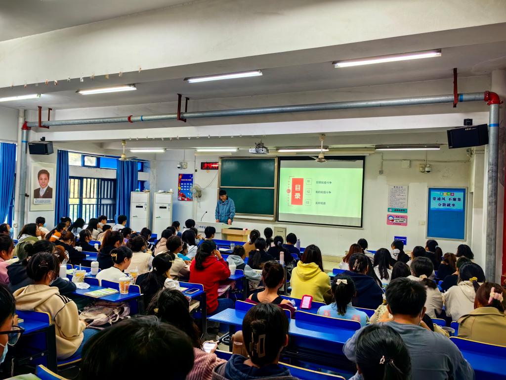 抗疫医护人员“齐进思政课堂·讲述抗疫故事”思政大课,11月1日上午在理论教学楼107教室2022级护理本科B班开讲,学校第二附属医院血透中心副护士长、主管护师唐天元做了首场专题大思政课。